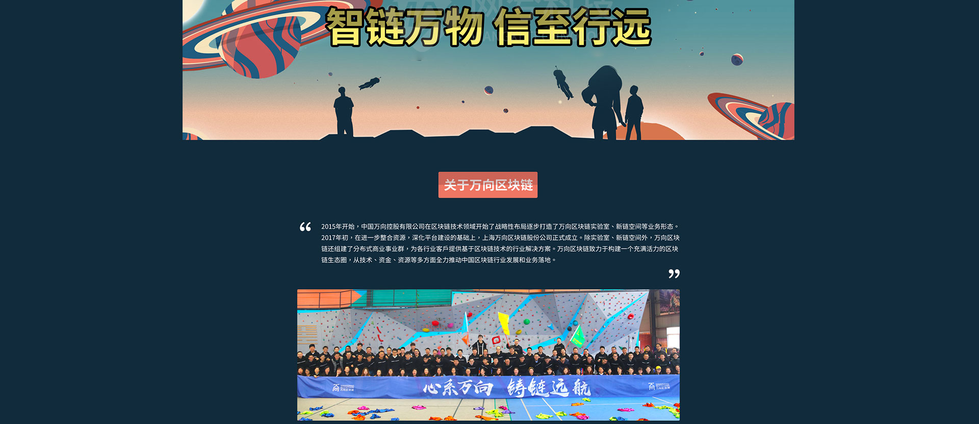 2015年开始,中国万向控股有限公司在区块链技术领域开始了战略性布局逐步打造了万向区块链实验室、新链空间等业务形态。2017年初,在进一步整合资源,深化平台建设的基础上,上海万向区块链股份公司正式成立。除实验室、新链空间外,万向区块链还组建了分布式商业事业群,为各行业客户提供基于区块链技术的行业解决方案。万向区块链致力于构建一个充满活力的区块链生态圈,从技术、资金、资源等多方面全力推动中国区块链行业发展和业务落地。